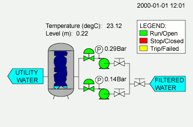 The HMI system usually presents the information to the operating personnel graphically, in the form of a mimic diagram. This means that the operator can see a schematic representation of the plant being controlled. For example, a picture of a pump connected to a pipe can show the operator that the pump is running and how much fluid it is pumping through the pipe at the moment. The operator can then switch the pump off. The HMI software will show the flow rate of the fluid in the pipe decrease in real time. Mimic diagrams may consist of line graphics and schematic symbols to represent process elements, or may consist of digital photographs of the process equipment overlain with animated symbols.